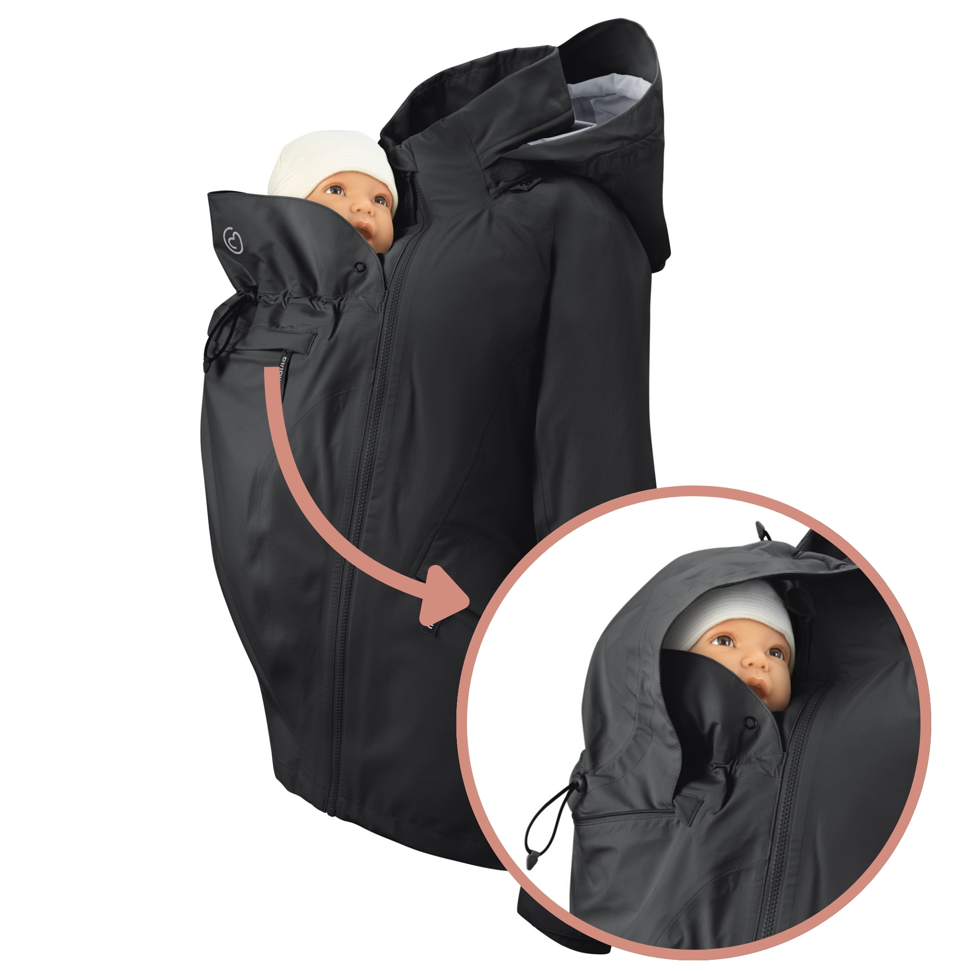 With two included inserts – one for pregnancy, one for babywearing in front and in the back – the Explorer adapts to every phase of motherhood. The baby insert adjusts to your little one’s size from birth up to 24 months, and zips up to your chest to keep you dry and protected. A drawstring at your baby’s neck blocks out cold drafts, while our unique rain guard hood fastens securely with wind straps, shielding your baby from even the strongest rain.