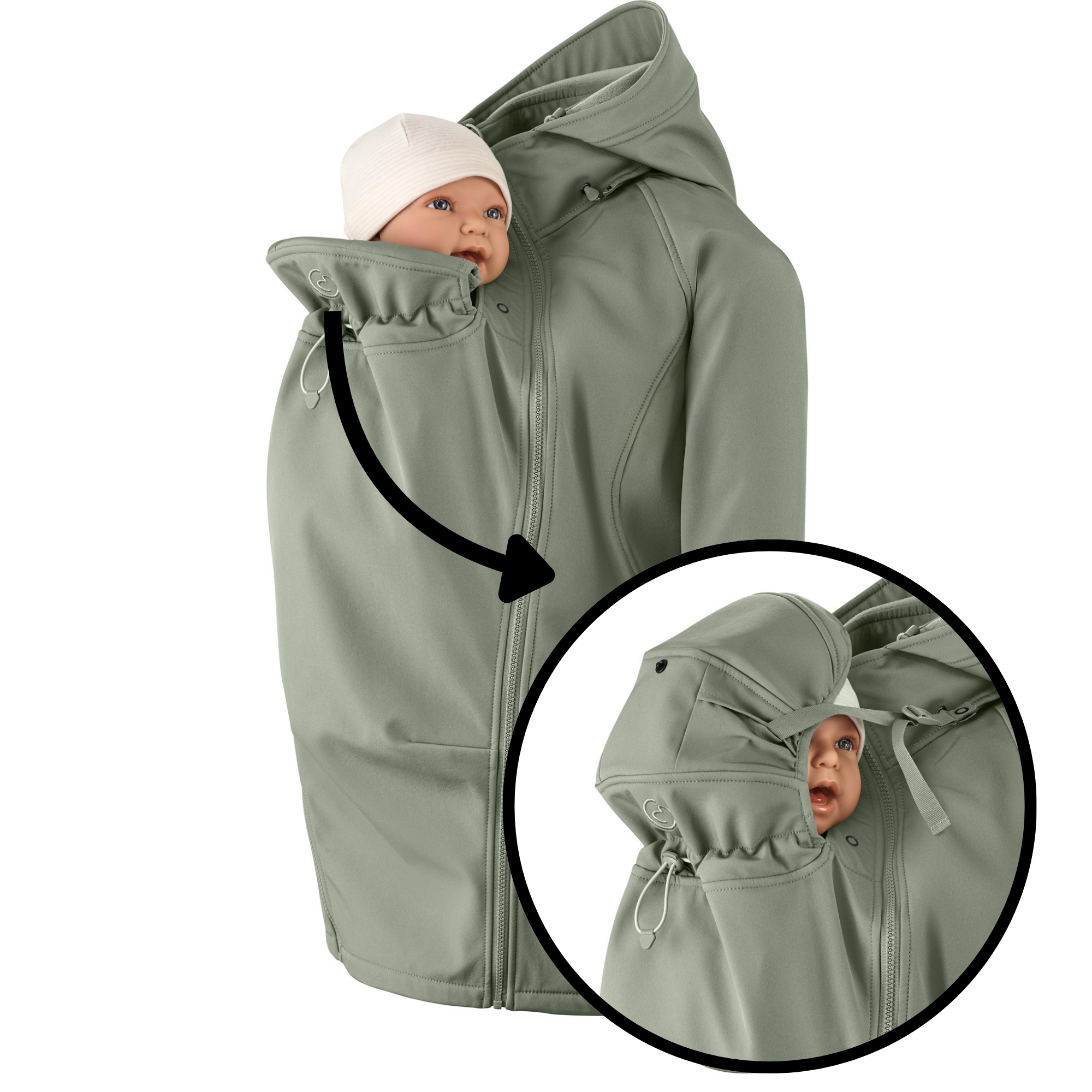 The baby insert adapts to your baby’s size from birth up to approx. 24 months and includes its own foldable hood. It shields from wind and doubles as head support when your little one falls asleep, simply attaching to the jacket for extra security. Ready for back carrying? No need to take off your hood anymore – it now fastens close to your neck so your baby has a clear view and free airways. No more lost hoods, no more fuss.